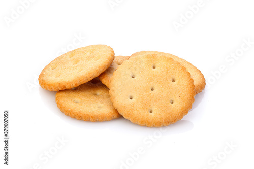 Dry cracker cookies isolated on white background. Saltines isolated. Top view, concept of food. Close-up. Full depth of fieldm.