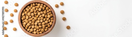 Dry dog food in bowl inside animal care setup concept. A wooden bowl filled with healthy soybeans on a white background.