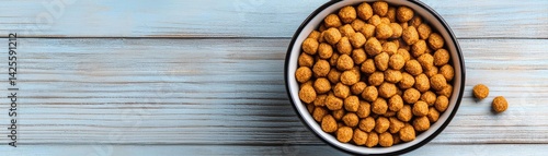 Dry dog food in bowl on wooden surface concept. A bowl of pet food on a rustic wooden surface.
