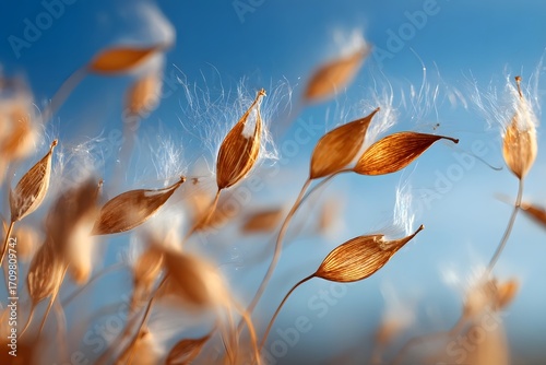 Dry, fluffy seed pods sway in the breeze under a clear blue sky.