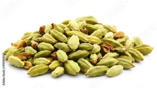 Dry green cardamom pods and seeds arranged on a white background showcasing their texture and natural color in closeup detail.