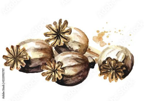Dry Poppy heads. Hand drawn watercolor illustration, isolated on white background