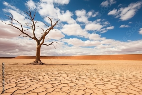 Dry tree among desert parched soil under cloudy skyDry tree among desert parched soil under cloudy sky