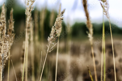 Dry yellow ears and gress in a cloudy autumn day