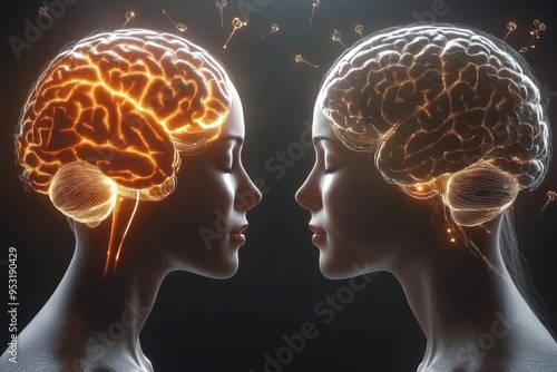 Dual glowing brain profiles of a couple symbolizing the intellectual connection and shared thoughts in a modern urban setting
