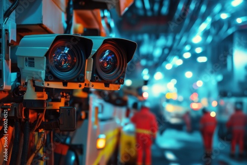 Dual surveillance cameras monitoring an industrial area with workers in the background