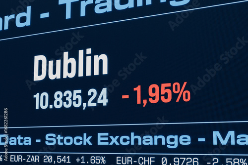 Dublin stock index moving down. Falling Irish share prices, bearmarket, reduction, investment, business, crash, loss, crisis, stock market data. 3D illustration