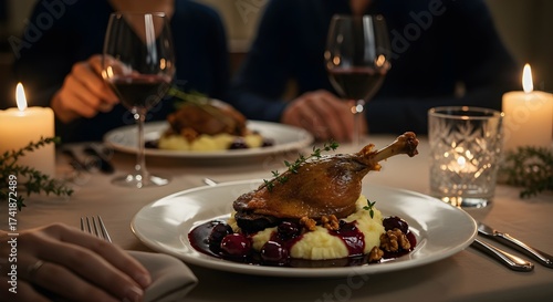 Duck confit dish elegantly served during a romantic candlelit dinner setting for two