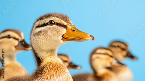 Duck farm, A close-up of a duckling with several other ducklings blurred in the background against a blue backdrop.