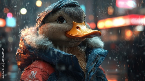 Duck in the Rain: A Portrait of Urban Resilience, Featuring Detailed Fur, Hooded Jacket, and City Lights in Bokeh, High Resolution, Emphasizing Texture and Atmosphere