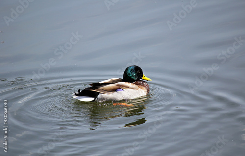duck on a wild lake, beautiful drake, bright colors, spreads its wings, clear water, beautiful nature