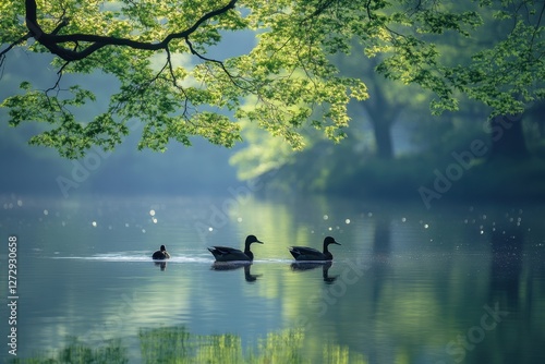 Ducks swim peacefully in a serene pond surrounded by lush greenery during early morning light