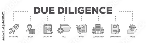 Due diligence icons process flow web banner illustration of potential, study, evaluating, files, invest, corporation, examination and value icon live stroke and easy to edit