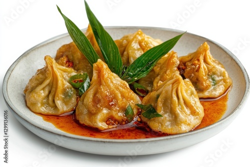Dumplings A plate of delicious dumplings garnished with green leaves in a flavorful sauce.