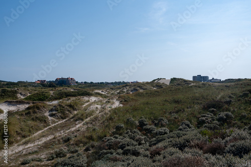 Dunes nature reserve with view of houses of the town of Egmond aan Zee