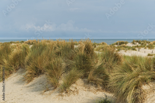 Dunkirk, France, Ammophila arenaria, beachgrass or marram grass, develops from a network of thick rhizomes that give it a firm anchor in its sandy substrate and anchors the dune to resist waves.