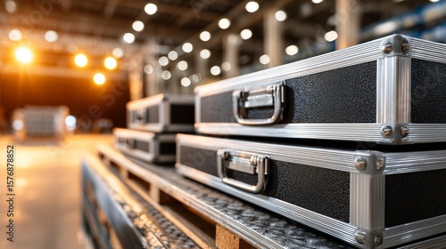 Durable black equipment cases stacked on a pallet in a bright industrial warehouse, symbolizing secure logistics and storage.