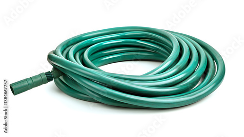 durable garden hose is coiled in circular shape, showcasing its flexibility and utility for outdoor watering tasks. green color adds natural touch, ideal for garden use