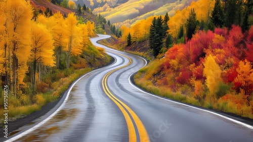 During autumn, a mountain road is surrounded by trees with fiery foliage, while a light fog settles over the area as rain begins to fall.