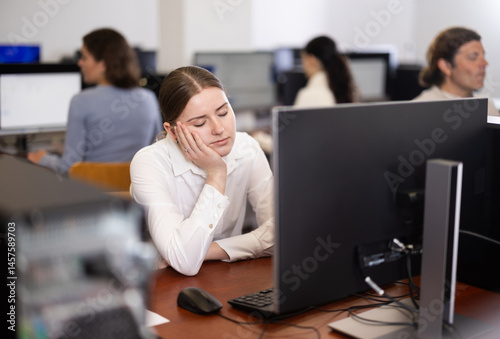 During break between classes of computer courses, exhausted female student sits at table, puts head on crossed arms and sleeps.