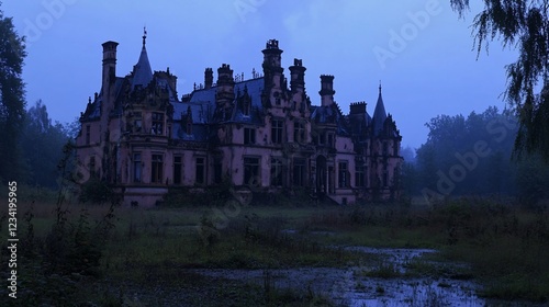 Dusk, ruined castle, overgrown field, misty background, Halloween