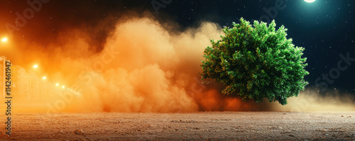 Dust crisis green tree in city life. A tree surrounded by swirling dust illuminated by streetlights at night.