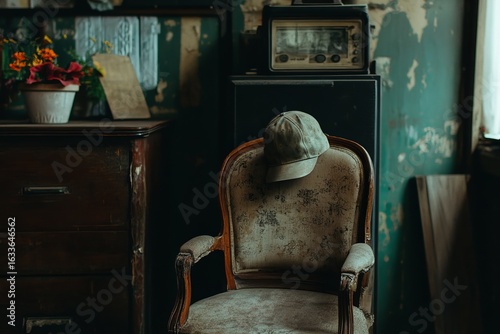 Dusty, antique chair with a cap, in a dimly lit, weathered room