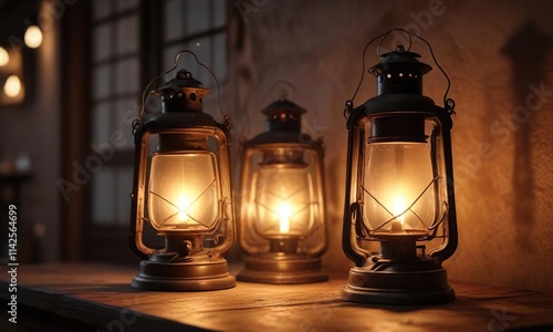 Dusty old lanterns casting a warm and inviting glow, warm ambiance, rustic charm