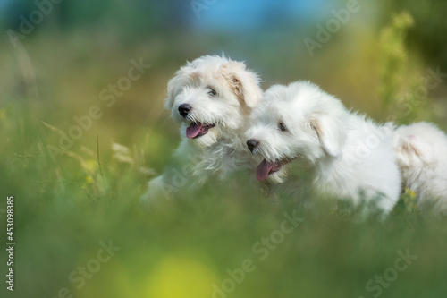 Dwa białe szczeniaki biegnące przez łąkę