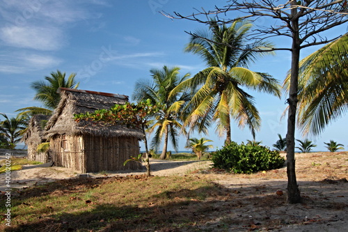 Dwellings of the Garifuna people on the Caribbean Sea coastline, near La Ceiba town. Honduras.