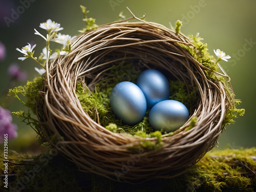 dyed easter eggs in bird nest woven with twigs flowers and moss