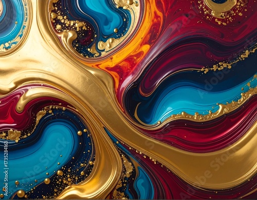 Dynamic abstract art featuring opulent gold waves flowing through rich blues and passionate reds