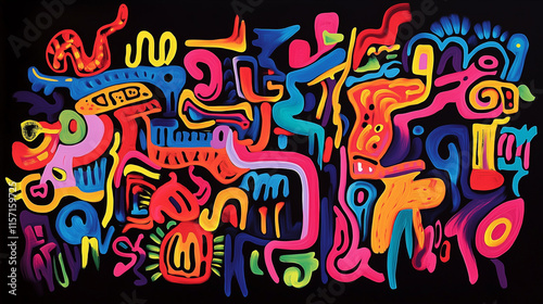 Dynamic abstract art with vibrant multicolored shapes and patterns on a dark background