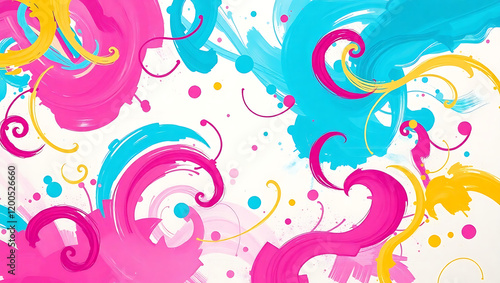 Dynamic abstract artwork with flowing paint strokes and playful dots on white