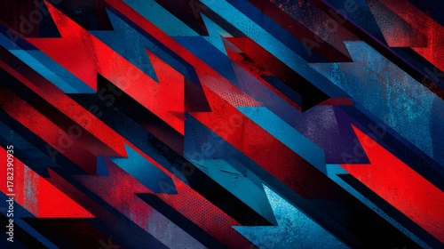 Dynamic abstract composition featuring intersecting diagonal stripes in intense red and deep blue tones