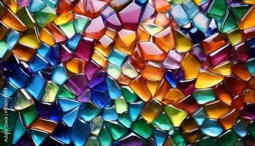 Dynamic abstract glass backdrop, mosaic of small, irregular glass pieces in bold contrasting colors.