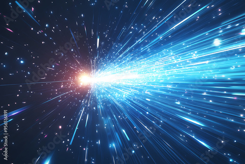 Dynamic abstract image of vibrant light trails and colorful particles converging towards a bright center, symbolizing speed and energy