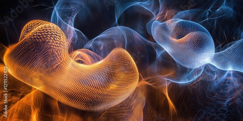 Dynamic abstract light painting background featuring swirling orange and blue textures against a dark backdrop with smooth, flowing forms.
