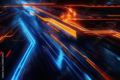 Dynamic abstract lines of blue and orange light creating a sense of motion and energy in a futuristic digital space.