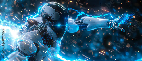 dynamic AI robot striking a winning pose The atmosphere is digital and very modern, blue lightning. Generative AI
