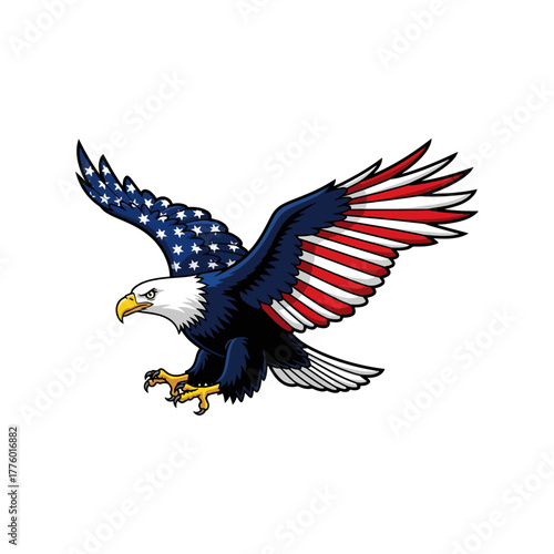 Dynamic American bald eagle illustration, patriotic national symbol with USA flag wings design.