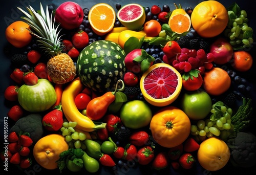 dynamic arrangement vibrant food elements showcasing colorful culinary delights eye catching composition, colors, fruits, vegetables, fresh, healthy