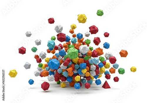 Dynamic assortment of vibrant polygonal shapes against pristine backdrop showcases complexity
