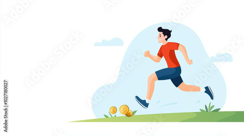 dynamic athlete running energetically with trail of coins behind him, showcasing determination and movement in vibrant flat design