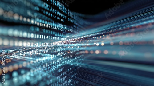Dynamic binary code streams flow through digital space creating a futuristic, high-speed data transfer effect for technology concepts