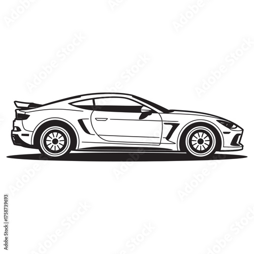Dynamic black and white outline illustration of a modern luxury sports car, side view