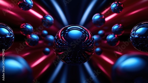 Dynamic blue and red spheres in motion abstract digital art futuristic environment close-up viewpoint