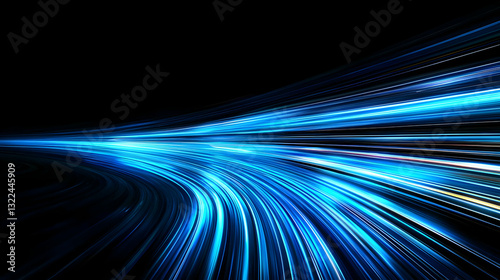 Dynamic Blue Light Trails Streaking Across a Dark Background in a Long Exposure Depicting Speed and Motion