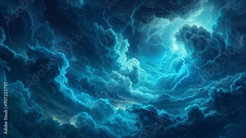 Dynamic blue storm clouds, lightning flickering shadows, dramatic atmosphere.