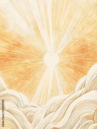 dynamic boho-style illustration featuring a radiant sunburst with flowing wave-like energy lines.
